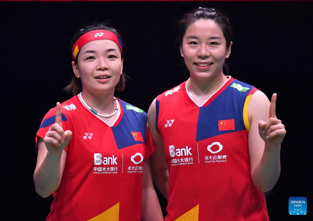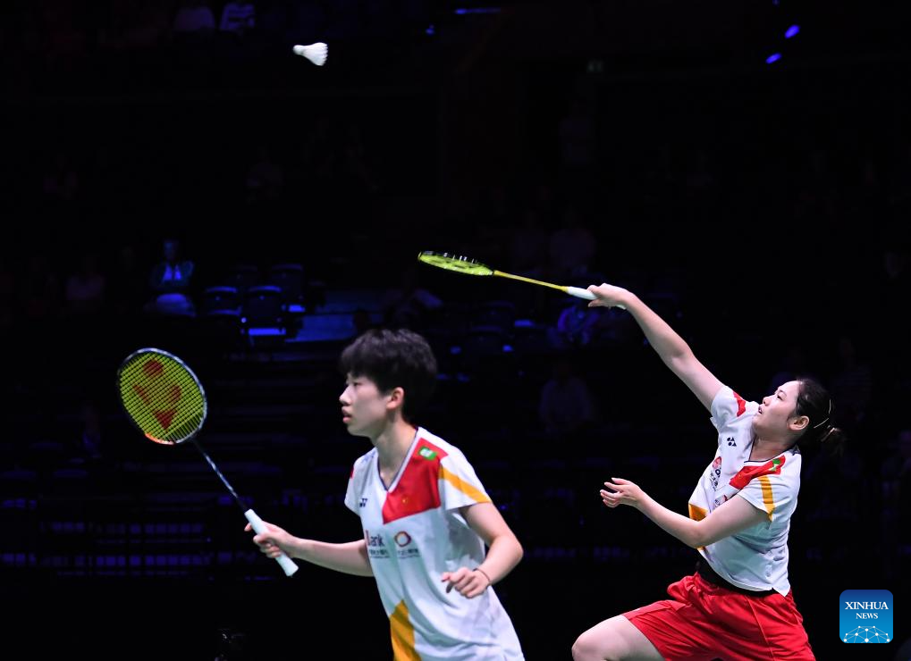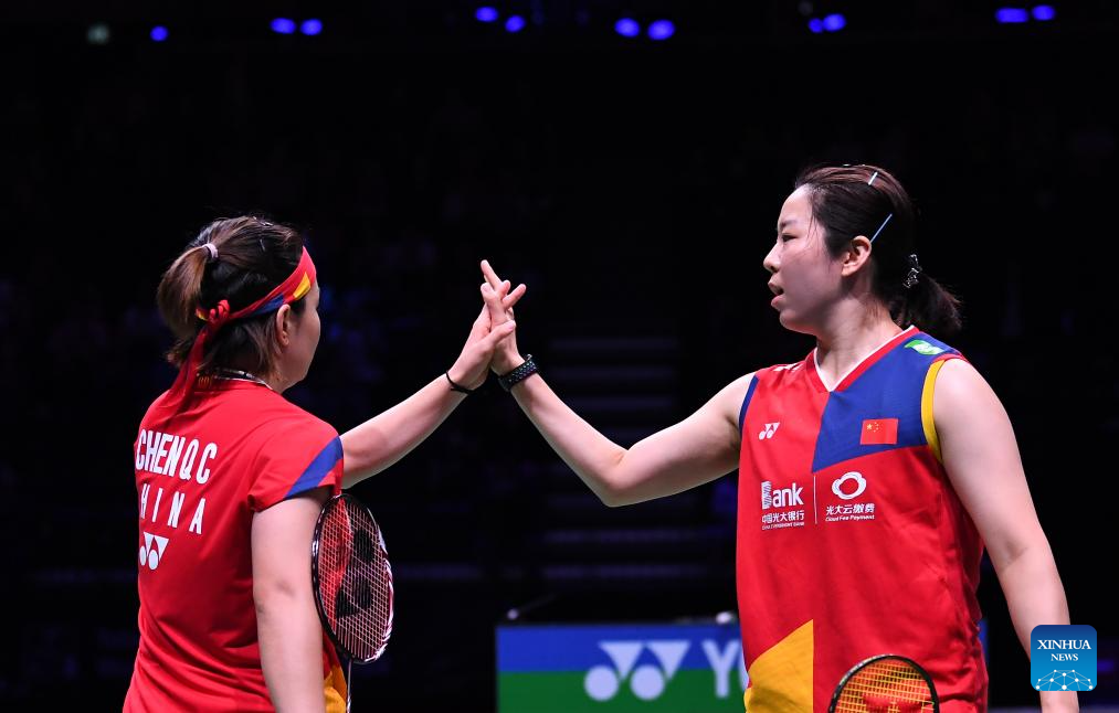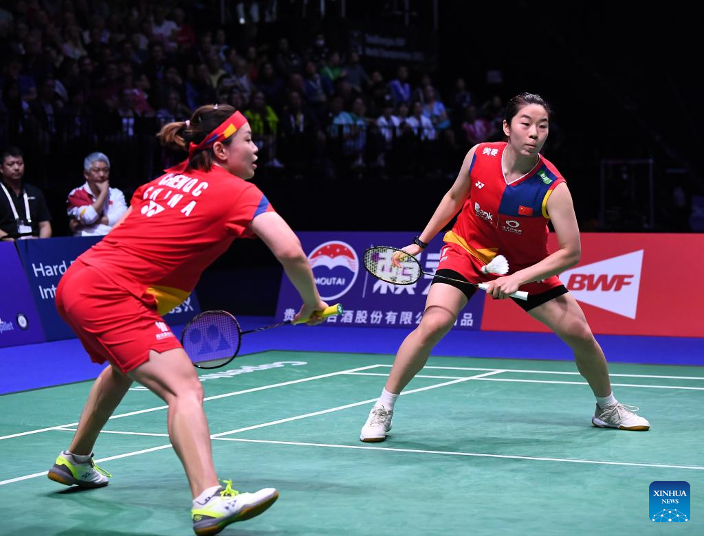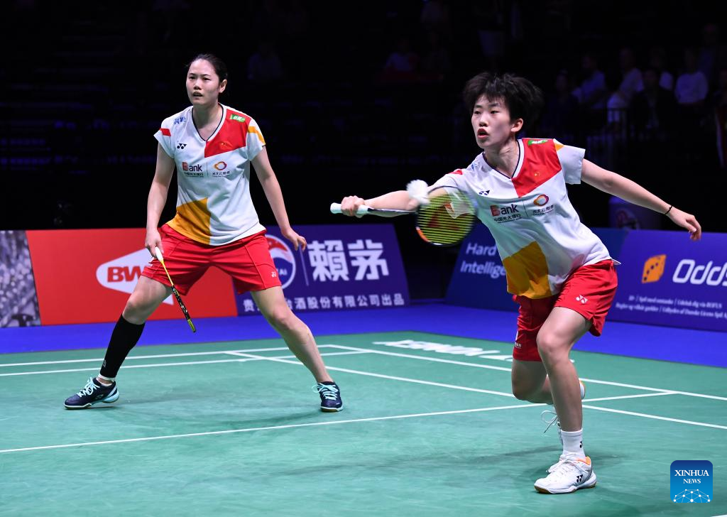 Chen Qingchen (R)/Jia Yifan of China compete during the women's doubles semifinal match against Zhang Shuxian/Zheng Yu of China at the BWF World Championships 2023 badminton tournament in Copenhagen, Denmark, Aug. 26, 2023. (Xinhua/Ren Pengfei)