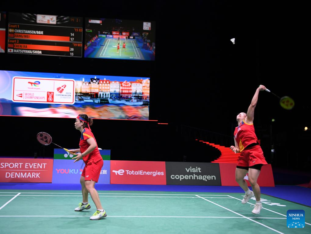Chen Qingchen (R)/Jia Yifan of China hit a return during the women's doubles quarterfinal match between Chen Qingchen/Jia Yifan of China and Matsuyama Nami/Shida Chiharu of Japan at the BWF World Championships 2023 in Copenhagen, Denmark, Aug. 25, 2023. (Xinhua/Ren Pengfei)
