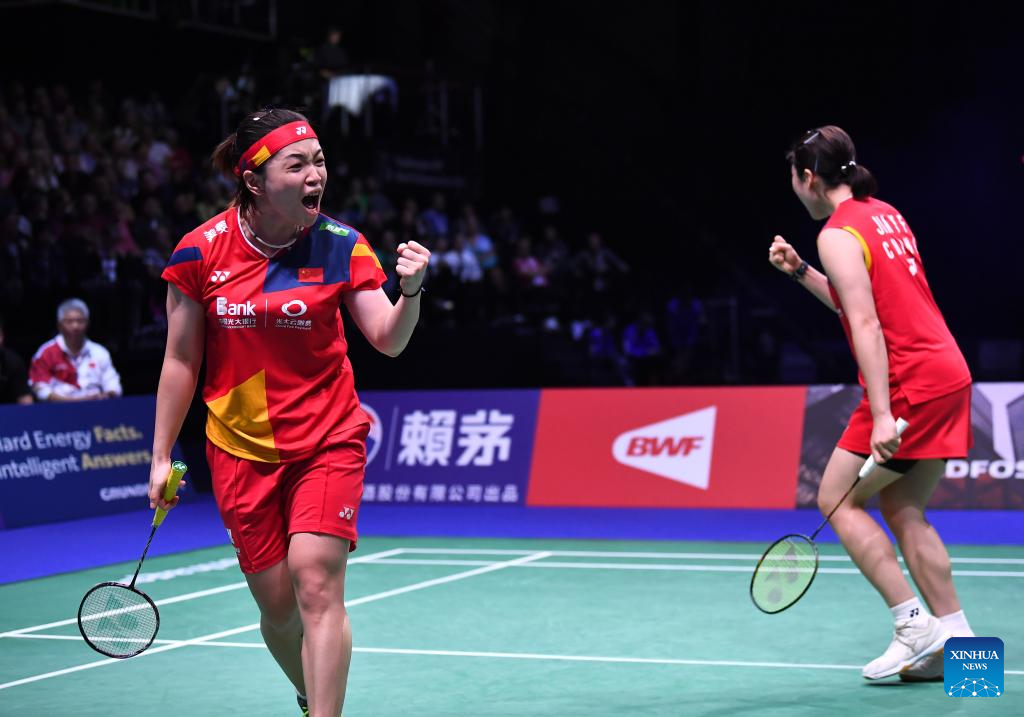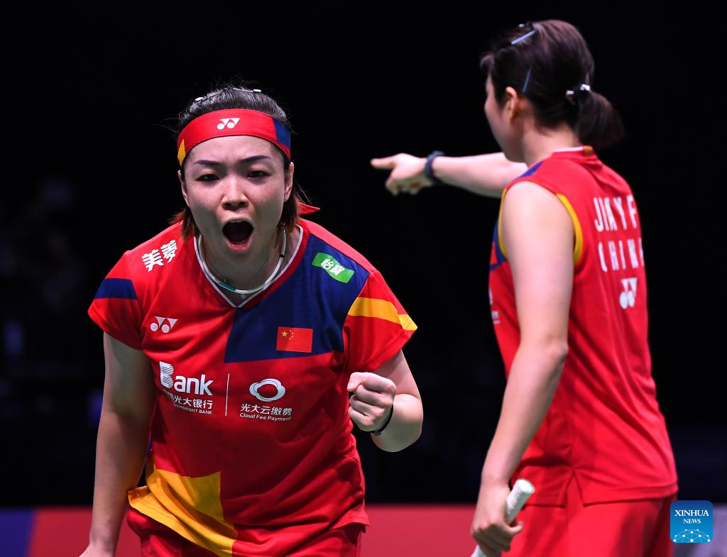 Chen Qingchen (L)/Jia Yifan of China react during the women's doubles semifinal match against Zhang Shuxian/Zheng Yu of China at the BWF World Championships 2023 badminton tournament in Copenhagen, Denmark, Aug. 26, 2023. (Xinhua/Ren Pengfei)