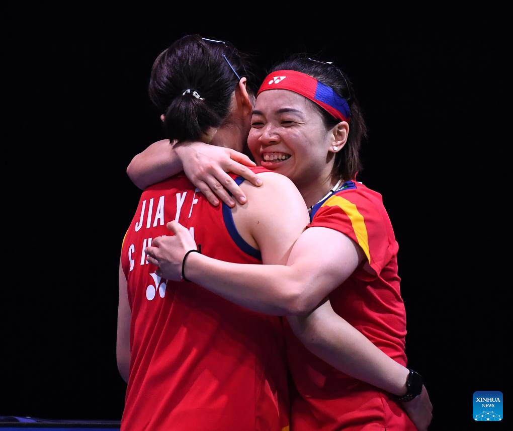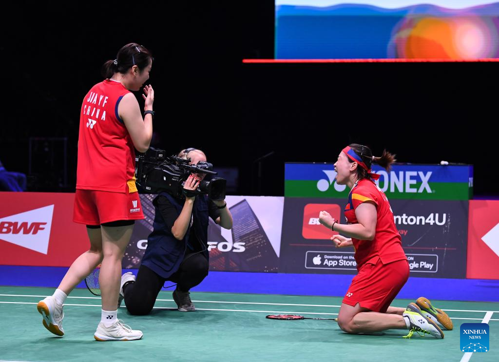 Chen Qingchen (L)/Jia Yifan of China celebrate during the women's doubles quarterfinal match between Chen Qingchen/Jia Yifan of China and Matsuyama Nami/Shida Chiharu of Japan at the BWF World Championships 2023 in Copenhagen, Denmark, Aug. 25, 2023. (Xinhua/Ren Pengfei)