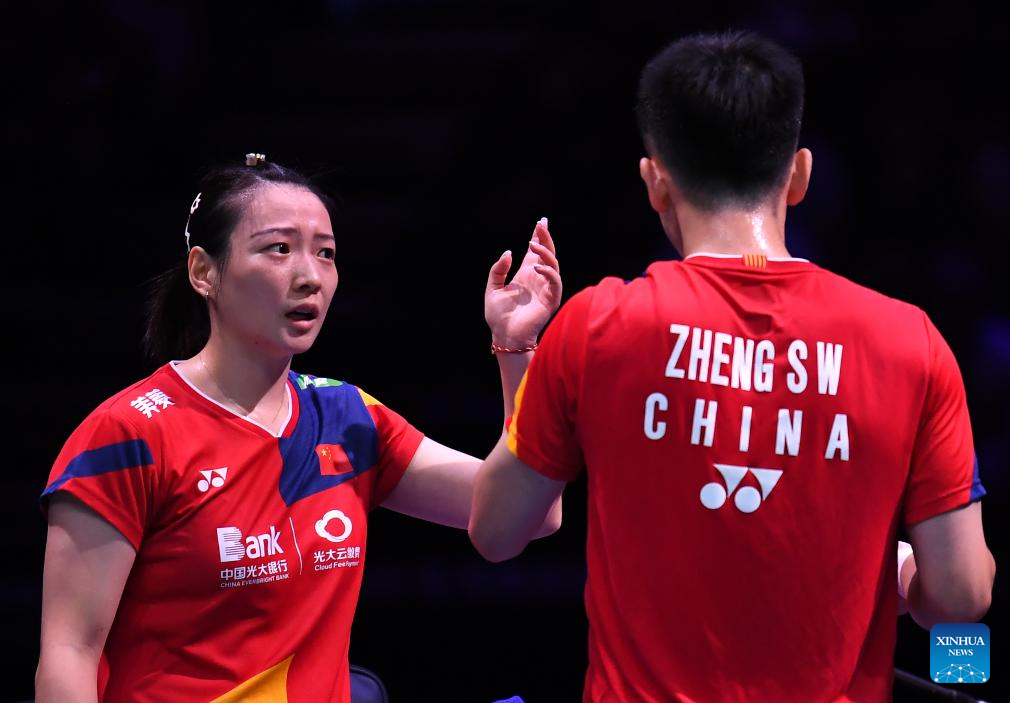 Zheng Siwei (L)/Huang Yaqiong of China communicate during the mixed doubles semifinal match against Jiang Zhenbang/Wei Yaxin of China at the BWF World Championships 2023 in Copenhagen, Denmark, Aug. 26, 2023. (Xinhua/Ren Pengfei)