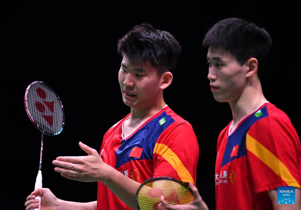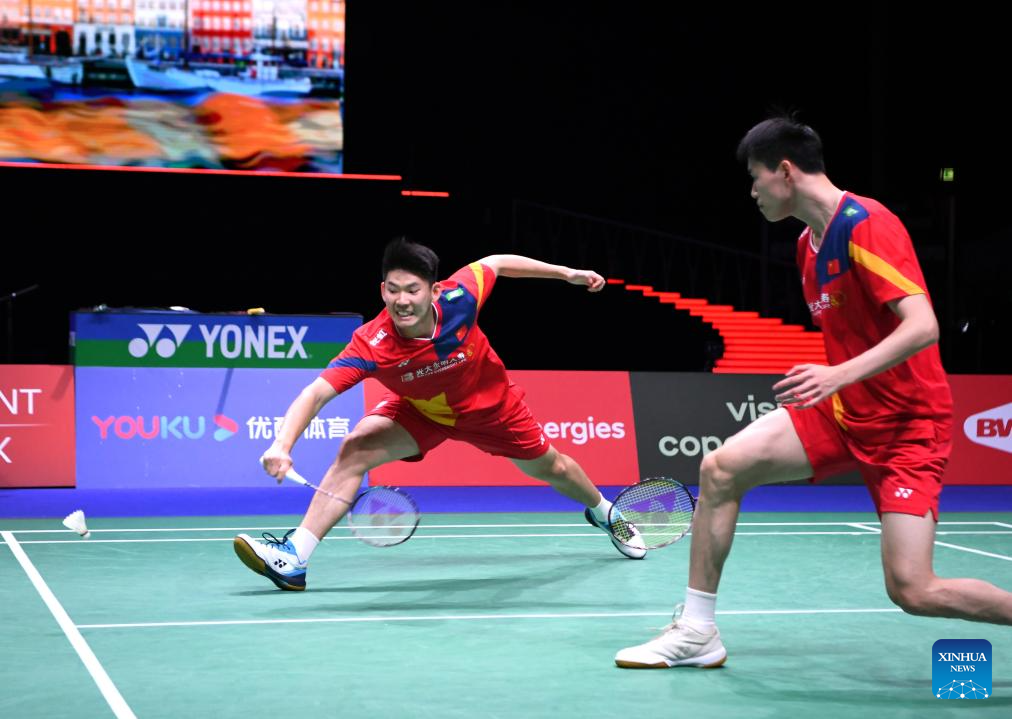 Liu Yuchen(L)/Ou Xuanyi of China compete during the men's doubles quarter final match against Aaron Chia/Soh Wooi Yik of Malaysia at the BWF World Championships 2023 in Copenhagen, Denmark, Aug. 25, 2023. (Xinhua/Ren Pengfei)