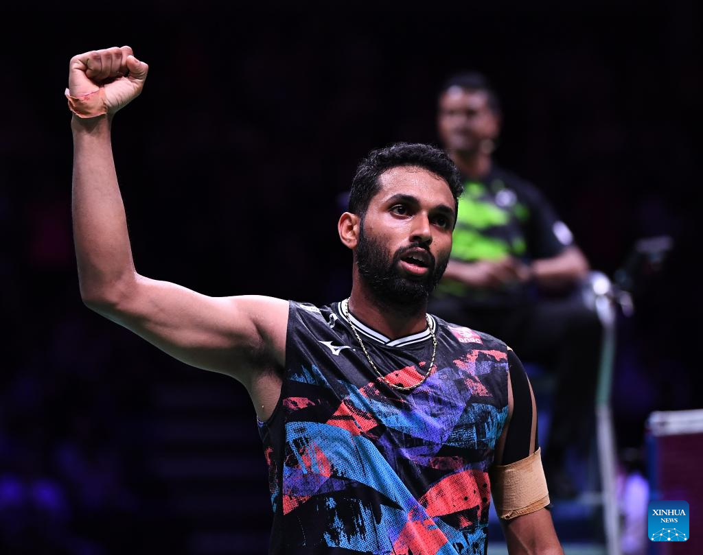 Prannoy H.S. of India celebrates after the men's singles quarter final match against Viktor Axelsen of Denmark at the BWF World Championships 2023 in Copenhagen, Denmark, Aug. 25, 2023. (Xinhua/Ren Pengfei)