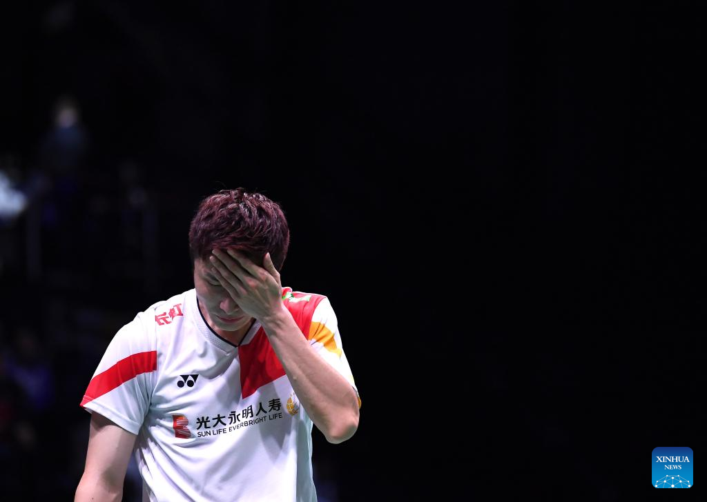 Shi Yuqi reacts during the men's singles quarterfinal match between Shi Yuqi of China and Naraoka Kodai of Japan at the BWF World Championships 2023 in Copenhagen, Denmark, Aug. 25, 2023. (Xinhua/Ren Pengfei)
