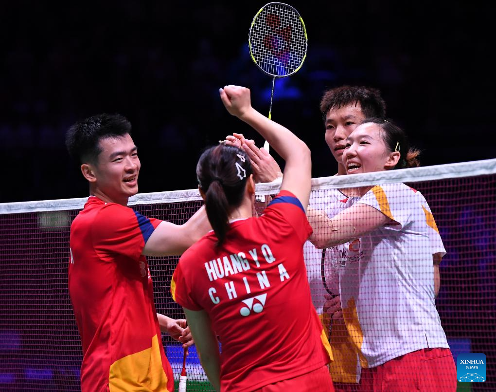 Zheng Siwei (1st L)/Huang Yaqiong (2nd L) of China and Jiang Zhenbang (3rd L)/Wei Yaxin of China greet after their mixed doubles semifinal match at the BWF World Championships 2023 in Copenhagen, Denmark, Aug. 26, 2023. (Xinhua/Ren Pengfei)