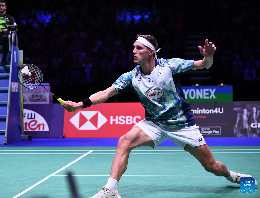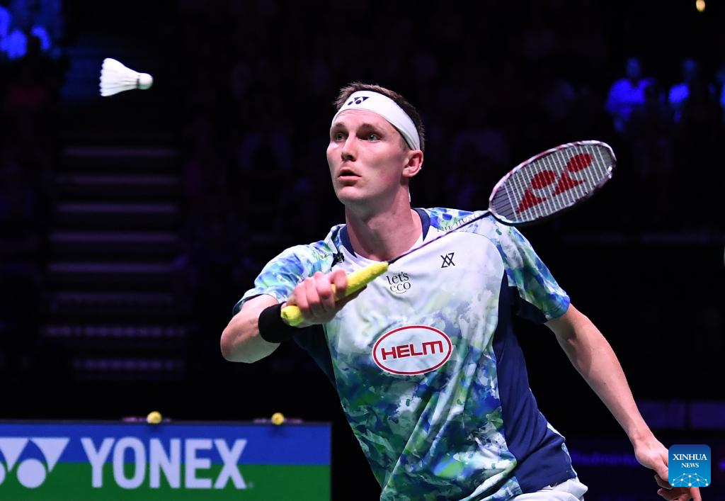 Viktor Axelsen of Denmark hits a return during the men's singles quarter final match against Prannoy H.S. of India at the BWF World Championships 2023 in Copenhagen, Denmark, Aug. 25, 2023. (Xinhua/Ren Pengfei)