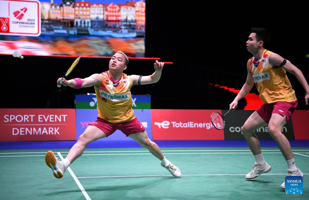 Aaron Chia(L)/Soh Wooi Yik of Malaysia compete during the men's doubles quarter final match against against Liu Yuchen/Ou Xuanyi of China at the BWF World Championships 2023 in Copenhagen, Denmark, Aug. 25, 2023. (Xinhua/Ren Pengfei)