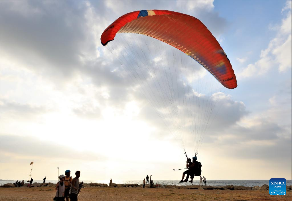 A paragliding tourist and a pilot are about to touch down at a landing site near Jounieh Bay, Lebanon, on Aug. 26, 2023. (Xinhua/Liu Zongya)