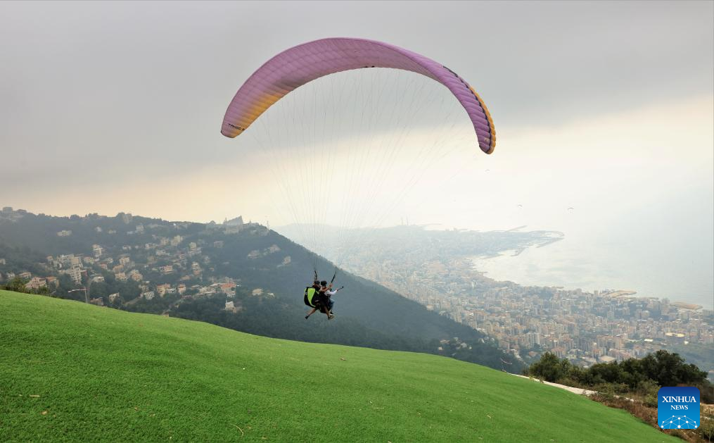 A paragliding tourist and a pilot take off from a hilltop launch site near Jounieh Bay, Lebanon, on Aug. 26, 2023. (Xinhua/Liu Zongya)