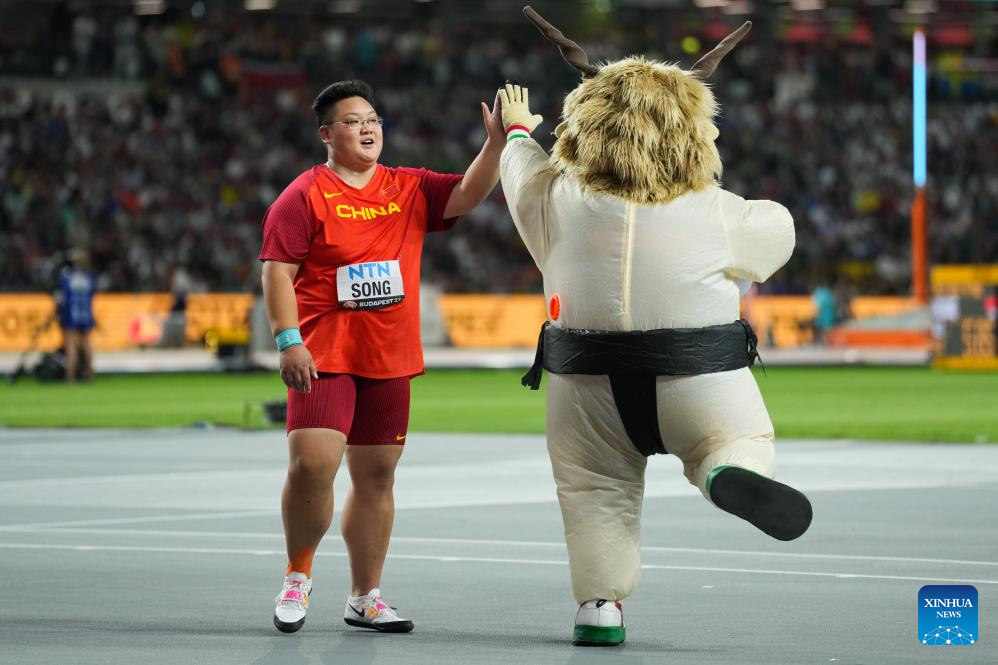Song Jiayuan of China greets the mascot ahead of the Women's Shot Put Final of the World Athletics Championships Budapest 2023 in Budapest, Hungary on Aug. 26, 2023. (Xinhua/Zheng Huansong)