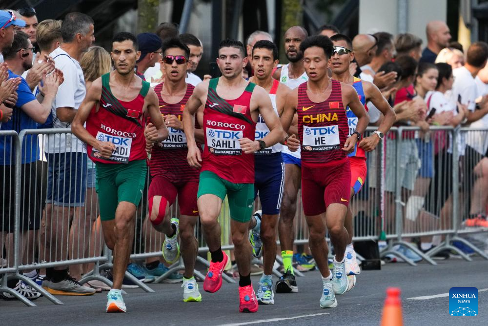 China's He Jie (2nd,R) and Yang Shaohui (2nd,L) compete in the Men's Marathon at the World Athletics Championships in Budapest, Hungary, Aug. 27, 2023. (Xinhua/Zheng Huansong)