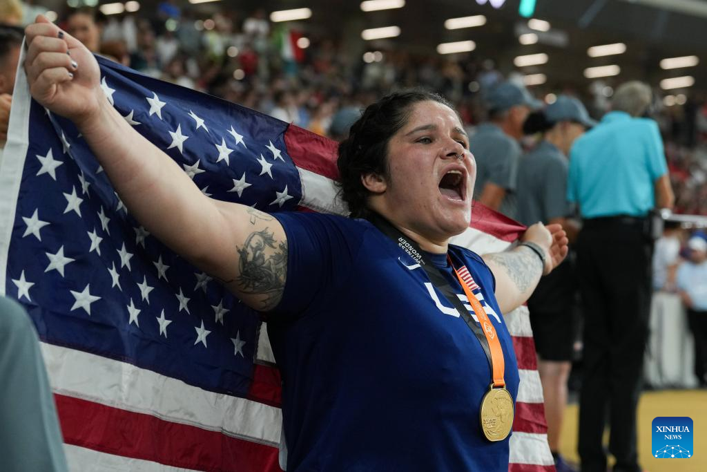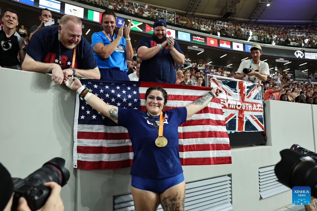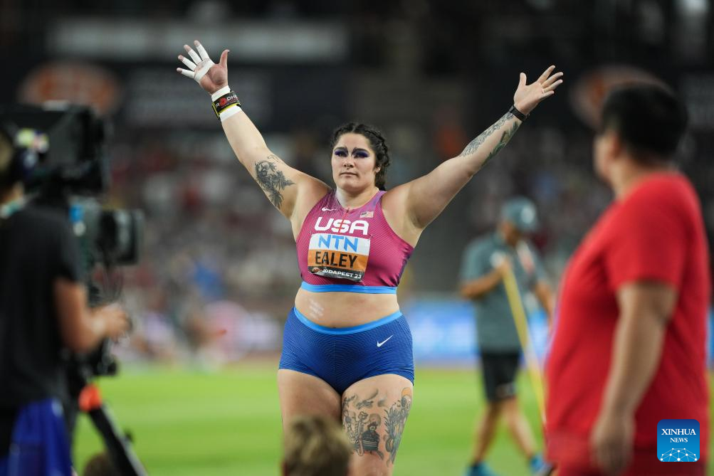 Chase Ealey of the United States celebrates after winning the Women's Shot Put Final of the World Athletics Championships Budapest 2023 in Budapest, Hungary on Aug. 26, 2023. (Xinhua/Zheng Huansong)