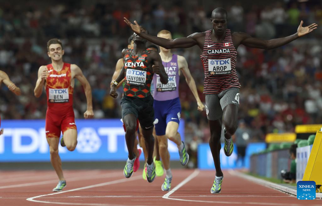 Marco Arop (1st R) of Canada celebrates after crossing the finish line during the men's 800m final at the World Athletics Championships in Budapest, Hungary, Aug. 26, 2023. (Xinhua/Li Ming)
