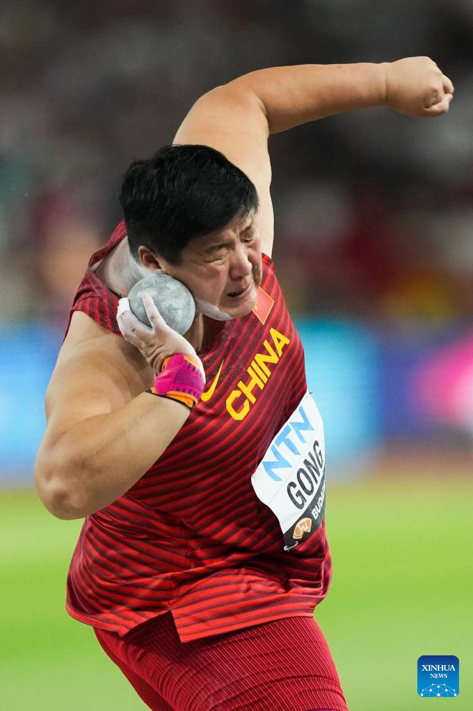Gong Lijiao of China competes during the Women's Shot Put Final of the World Athletics Championships Budapest 2023 in Budapest, Hungary on Aug. 26, 2023. (Xinhua/Zheng Huansong)