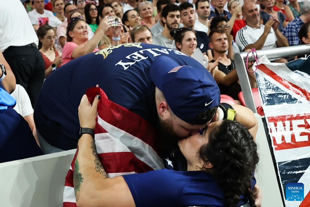 Chase Ealey of the United States is congratulated after winning the Women's Shot Put Final of the World Athletics Championships Budapest 2023 in Budapest, Hungary on Aug. 26, 2023. (Xinhua/Zheng Huansong)