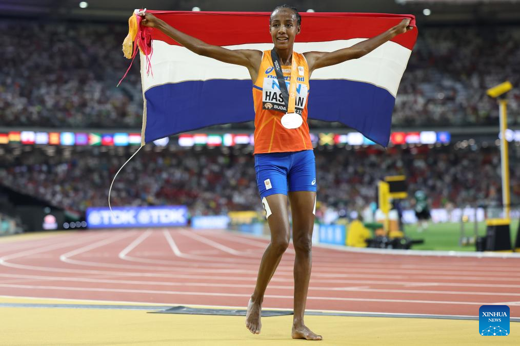 Sifan Hassan of Netherlands celebrates after the Women's 5000m Final of the World Athletics Championships Budapest 2023 in Budapest, Hungary on Aug. 26, 2023. (Xinhua/Li Ming)