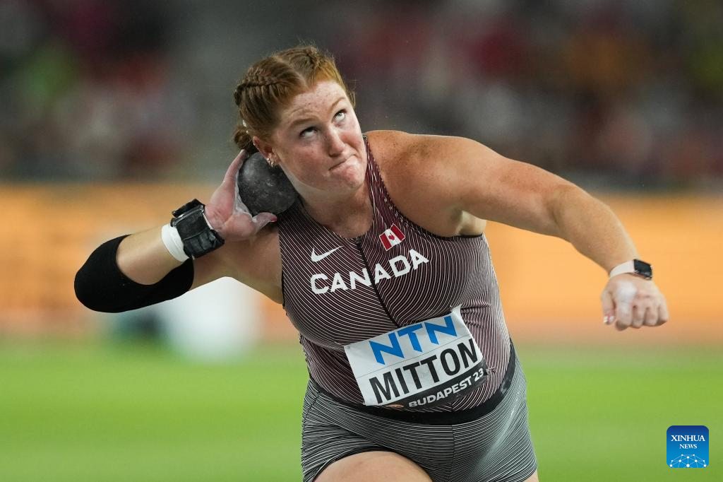 Sarah Mitton of Canada competes during the Women's Shot Put Final of the World Athletics Championships Budapest 2023 in Budapest, Hungary on Aug. 26, 2023. (Xinhua/Zheng Huansong)