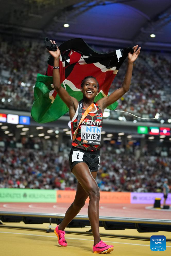 Faith Kipyegon of Kenya celebrates her victory after the Women's 5000m Final of the World Athletics Championships Budapest 2023 in Budapest, Hungary on Aug. 26, 2023. (Xinhua/Zheng Huansong)