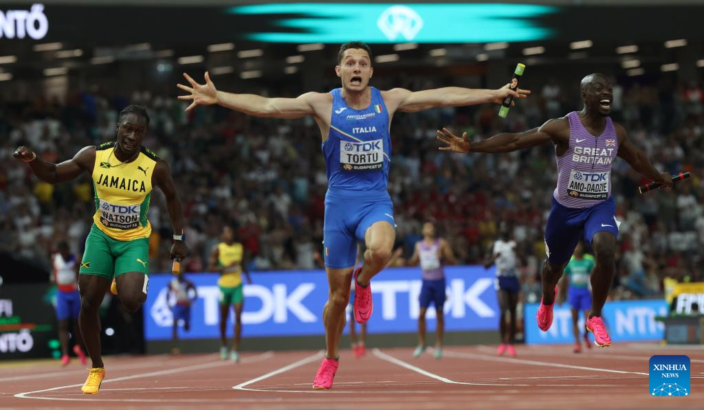 Italy's Filippo Tortu (C) crosses the finish line during the men's 4x100 meters relay final at the World Athletics Championships Budapest 2023 in Budapest, Hungary on Aug. 26, 2023. (Xinhua/Li Ming)