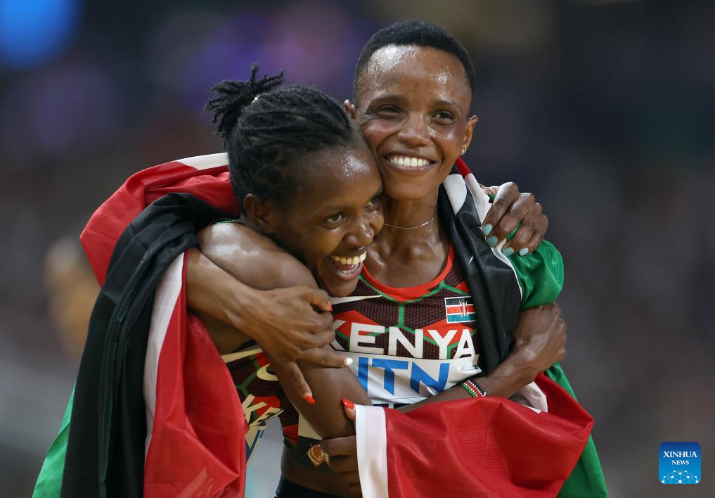 Faith Kipyegon (L) of Kenya celebrates with her teammate Beatrice Chebet after the Women's 5000m Final of the World Athletics Championships Budapest 2023 in Budapest, Hungary on Aug. 26, 2023. (Xinhua/Li Ming)