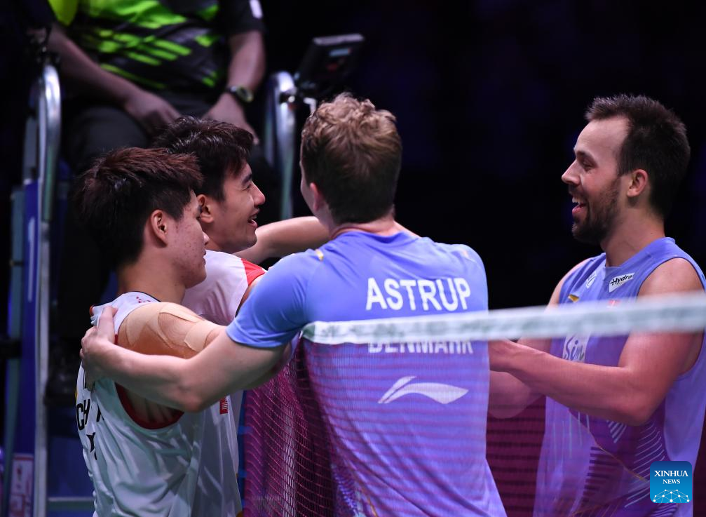 Liang Weikeng (1st L)/Wang Chang (2nd L) of China greet Kim Astrup (2nd R)/Anders Skaarup Rasmussen of Denmark after their men's doubles semifinal match at the BWF World Championships 2023 in Copenhagen, Denmark, Aug. 26, 2023. (Xinhua/Ren Pengfei)