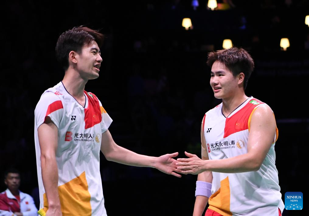Liang Weikeng (R)/Wang Chang of China react during the men's doubles semifinal match against Kim Astrup/Anders Skaarup Rasmussen of Denmark at the BWF World Championships 2023 in Copenhagen, Denmark, Aug. 26, 2023. (Xinhua/Ren Pengfei)
