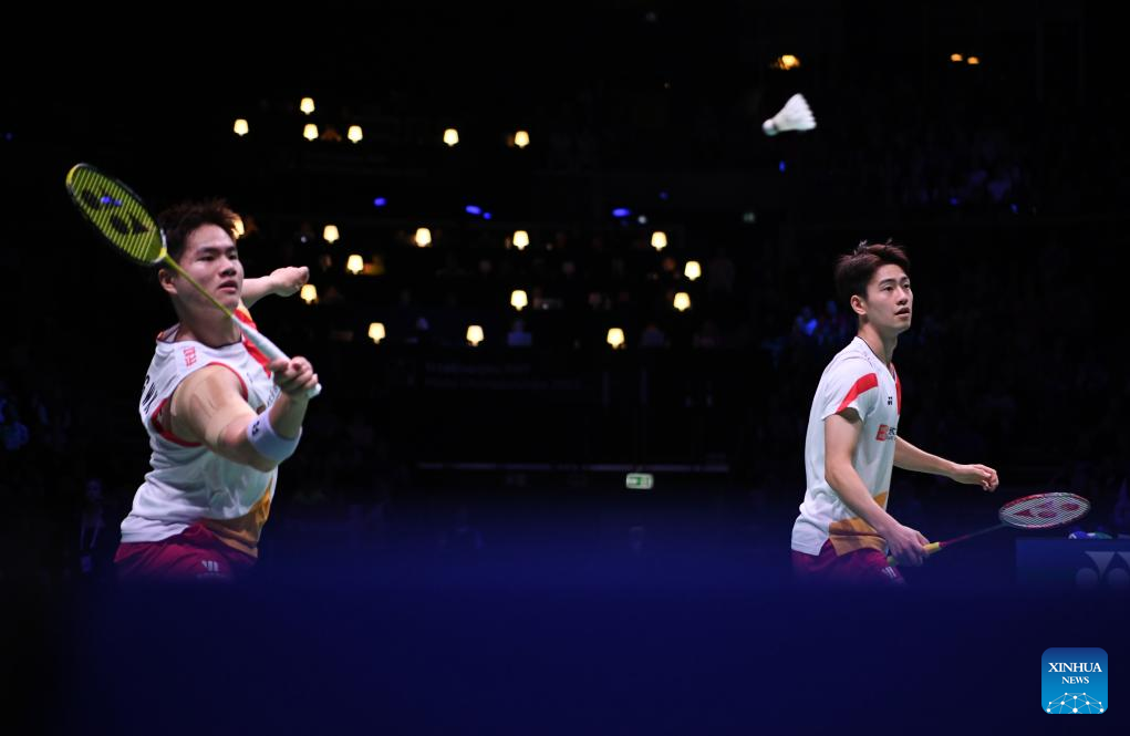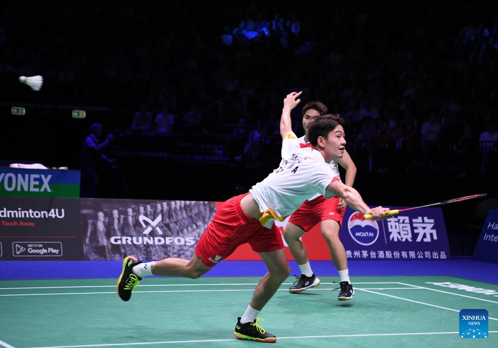 Liang Weikeng/Wang Chang (L) of China compete during the men's doubles semifinal match against Kim Astrup/Anders Skaarup Rasmussen of Denmark at the BWF World Championships 2023 in Copenhagen, Denmark, Aug. 26, 2023. (Xinhua/Ren Pengfei)