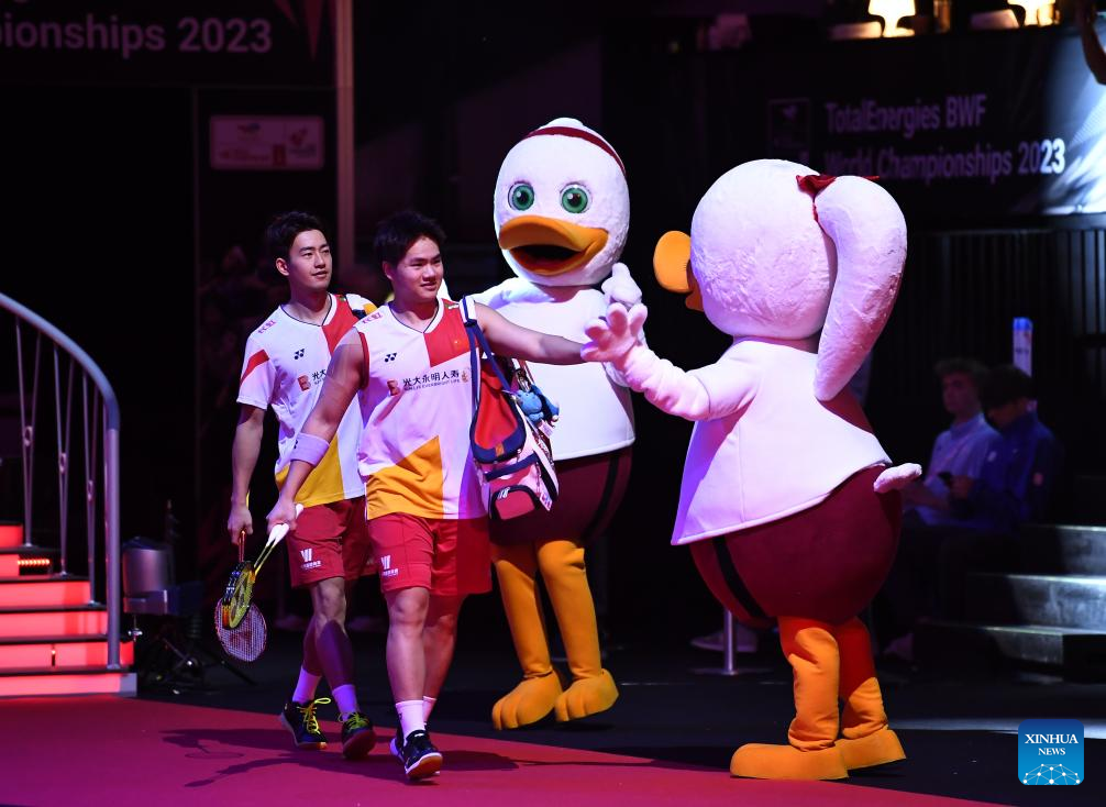 Liang Weikeng/Wang Chang (L) of China walk into the court before the men's doubles semifinal match against Kim Astrup/Anders Skaarup Rasmussen of Denmark at the BWF World Championships 2023 in Copenhagen, Denmark, Aug. 26, 2023. (Xinhua/Ren Pengfei)