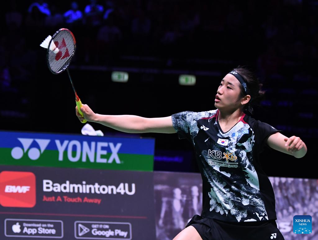 An Se Young of South Korea hits a return during the women's singles semifinal match between Chen Yufei of China and An Se Young of South Korea at the BWF World Championships 2023 in Copenhagen, Denmark, Aug. 26, 2023. (Xinhua/Ren Pengfei)