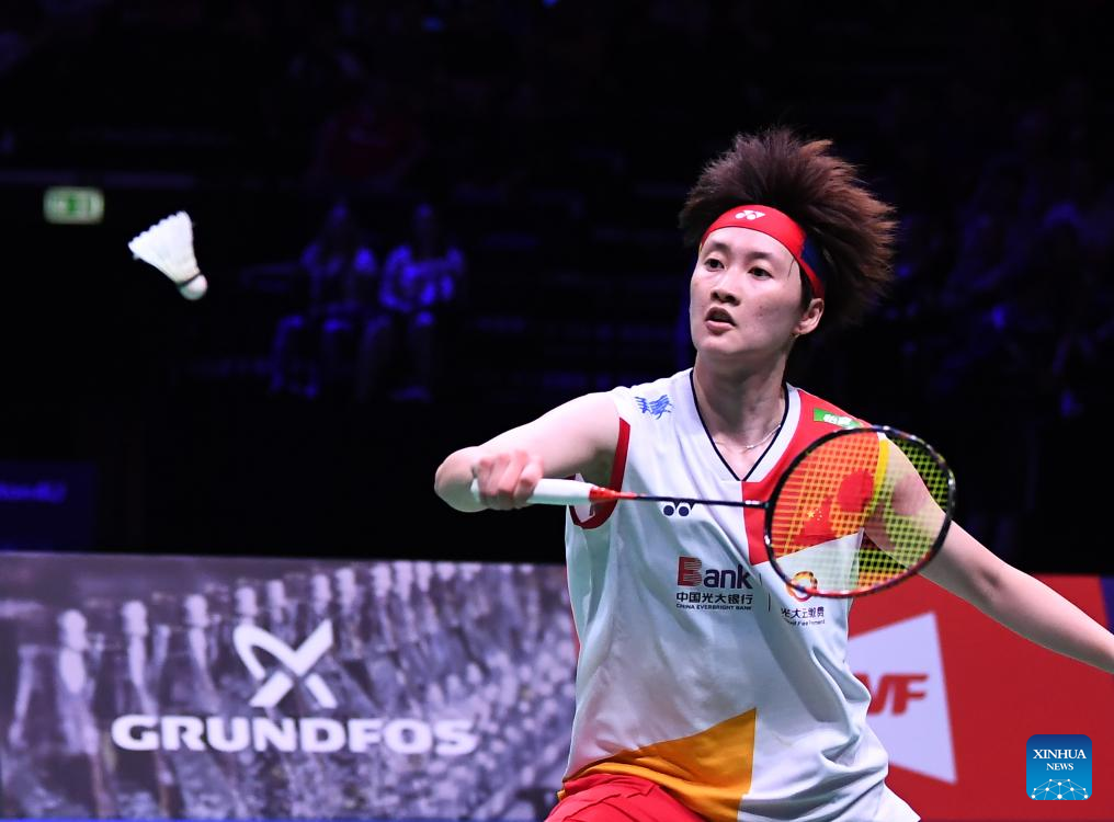 Chen Yufei of China hits a return during the women's singles semifinal match between Chen Yufei of China and An Se Young of South Korea at the BWF World Championships 2023 in Copenhagen, Denmark, Aug. 26, 2023. (Xinhua/Ren Pengfei)