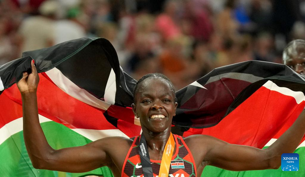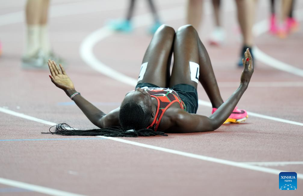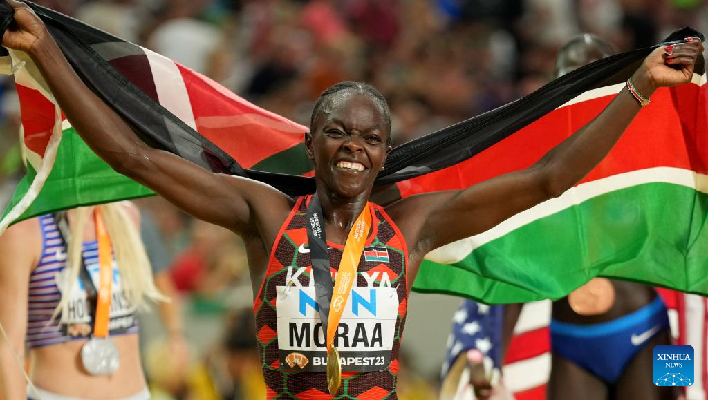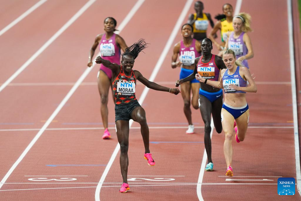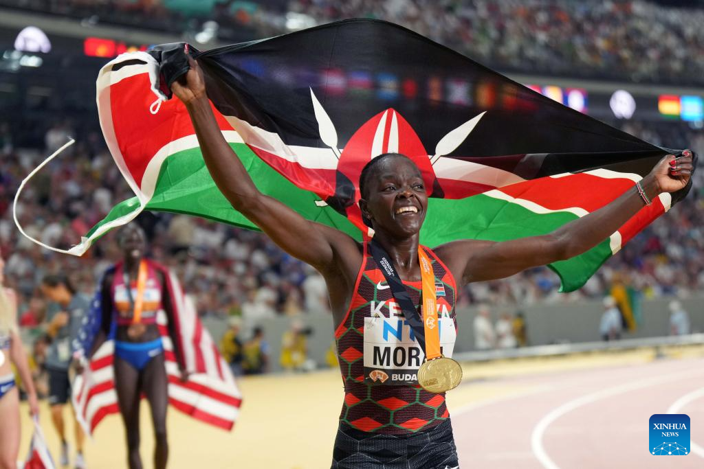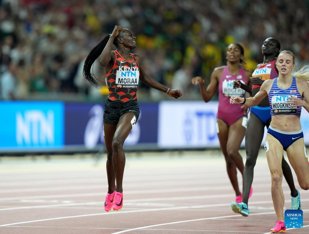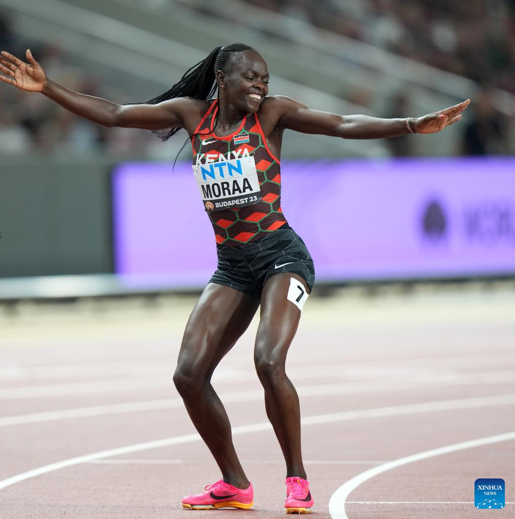 Mary Moraa of Kenya celebrates after the Women's 800m Final of the World Athletics Championships Budapest 2023 in Budapest, Hungary, Aug. 27, 2023. (Xinhua/Song Yanhua)