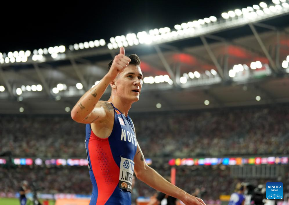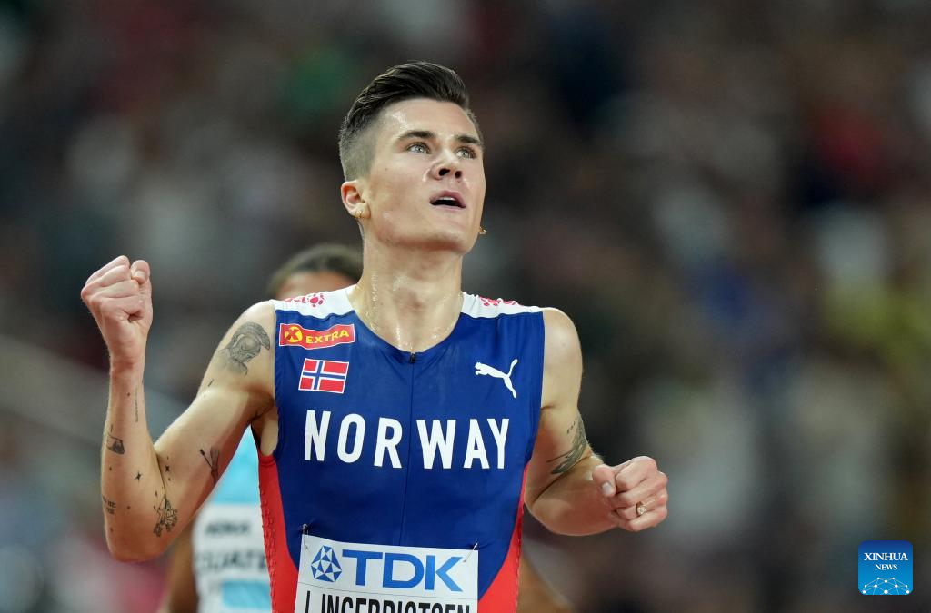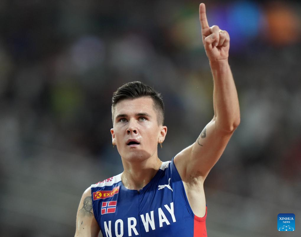 Jakob Ingebrigtsen of Norway celebrates after the Men's 5000m Final of the World Athletics Championships Budapest 2023 in Budapest, Hungary, Aug. 27, 2023. (Xinhua/Li Ying)