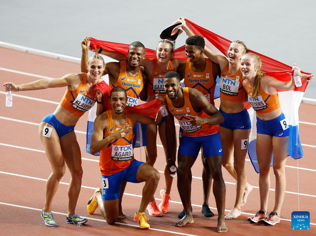 Athletes of the Netherlands celebrate after the Women's 4x400m Relay Final of the World Athletics Championships Budapest 2023 in Budapest, Hungary, Aug. 27, 2023. (Xinhua/Zheng Huansong)