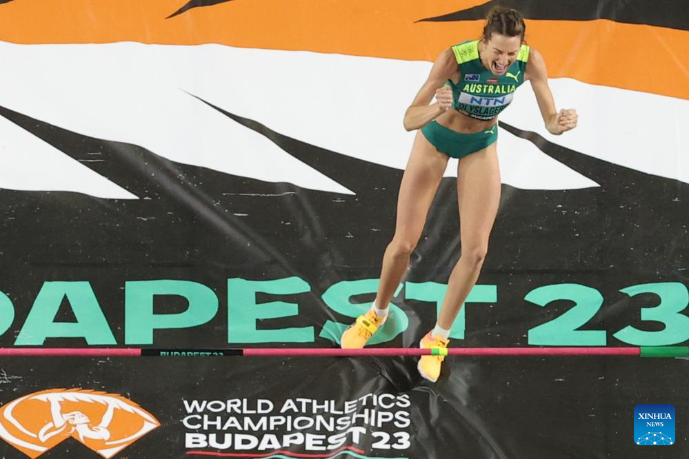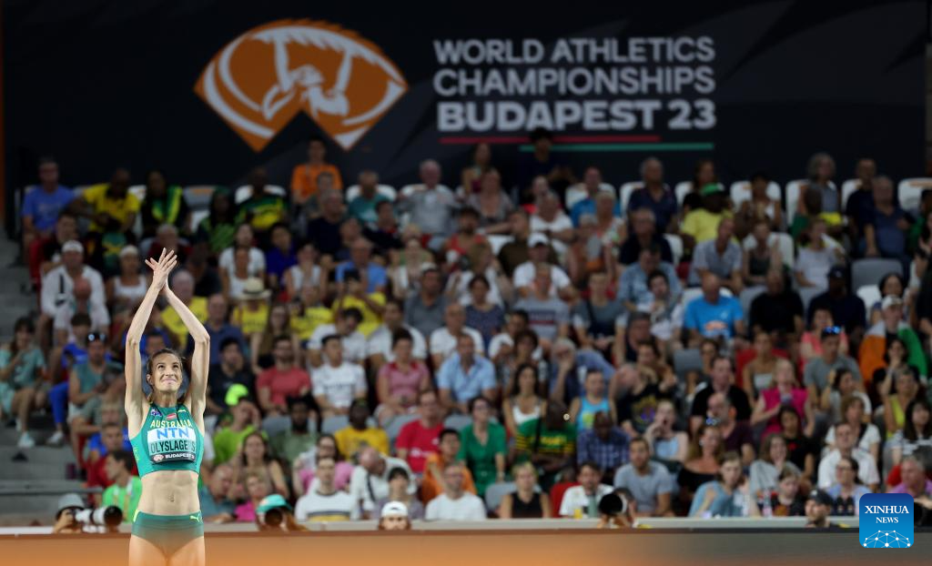 Nicola Olyslagers of Australia celebrates during the Women's High Jump Final of the World Athletics Championships Budapest 2023 in Budapest, Hungary, Aug. 27, 2023. (Xinhua/Meng Dingbo)