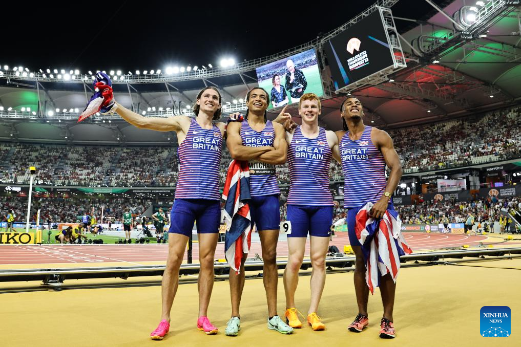 (From L to R) Lewis Davey, Rio Mitcham, Charles Dobson and Alex Haydock-Wilson of Britain pose for pictures after the Men's 4x400m Relay Final of the World Athletics Championships Budapest 2023 in Budapest, Hungary, Aug. 27, 2023. (Xinhua/Zheng Huansong)