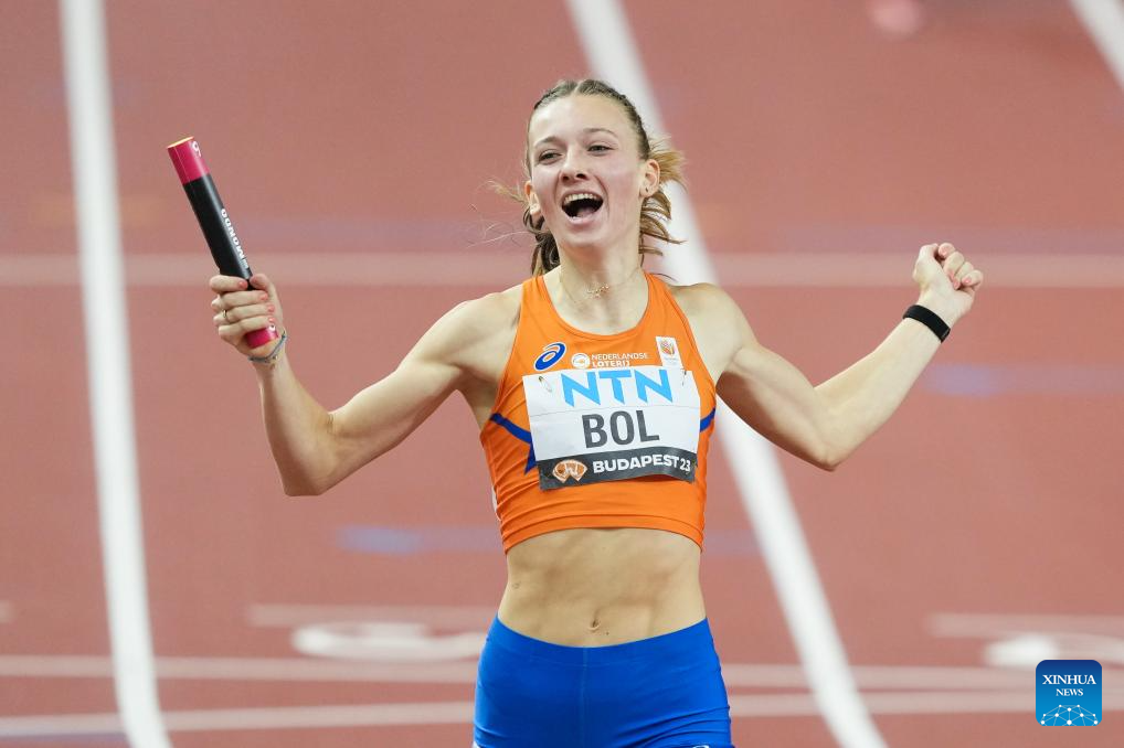 Femke Bol of the Netherlands celebrates after the Women's 4x400m Relay Final of the World Athletics Championships Budapest 2023 in Budapest, Hungary, Aug. 27, 2023. (Xinhua/Zheng Huansong)