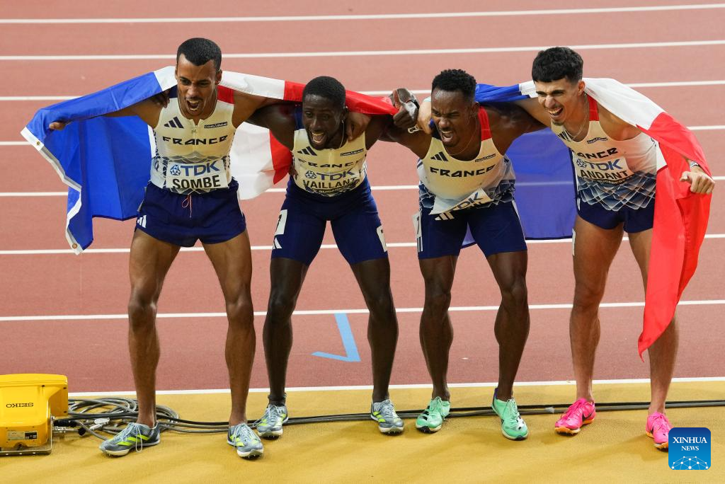 (L-R) David Sombe, Ludvy Vaillant, Gilles Biron and Teo Andant of France pose for pictures after the Men's 4x400m Relay Final of the World Athletics Championships Budapest 2023 in Budapest, Hungary, Aug. 27, 2023. (Xinhua/Zheng Huansong)