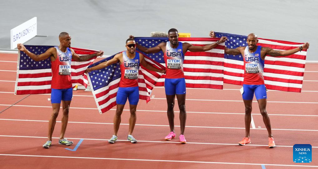 (L-R) Quincy Hall, Justin Robinson, Rai Benjamin and Vernon Norwood of the United States pose for pictures after the Men's 4x400m Relay Final of the World Athletics Championships Budapest 2023 in Budapest, Hungary, Aug. 27, 2023. (Xinhua/Zheng Huansong)