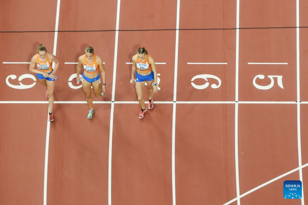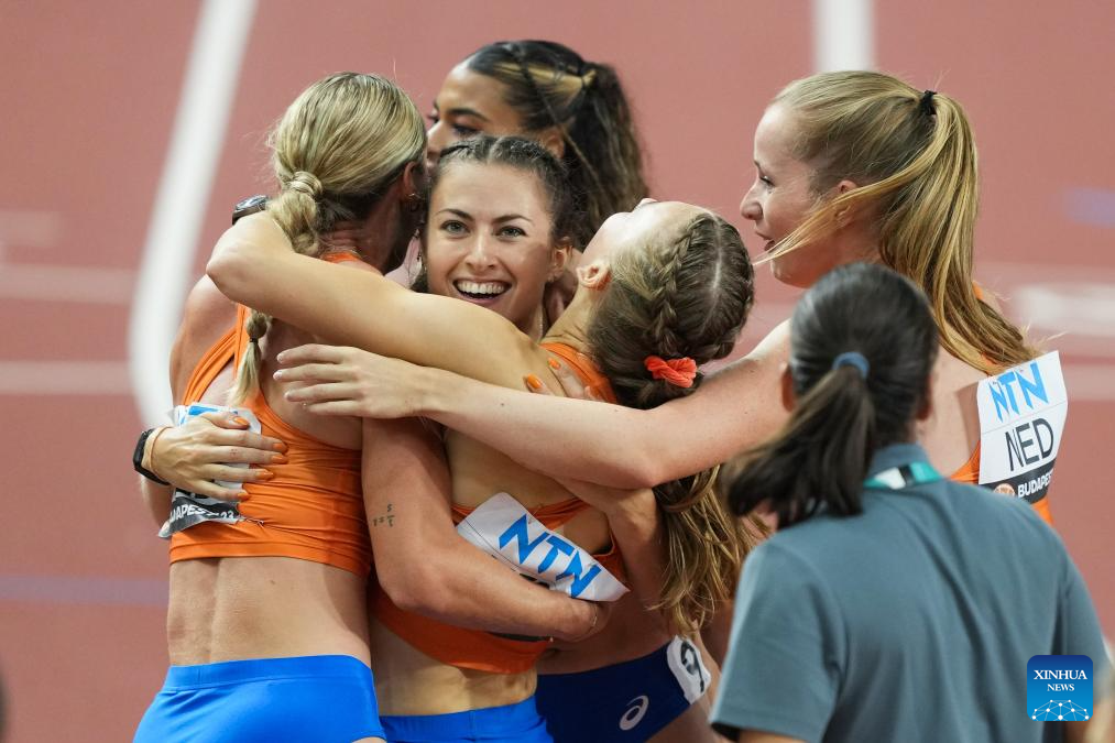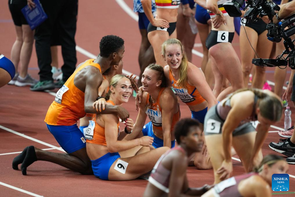Athletes of the Netherlands react after the Women's 4x400m Relay Final of the World Athletics Championships Budapest 2023 in Budapest, Hungary, Aug. 27, 2023. (Xinhua/Meng Dingbo)