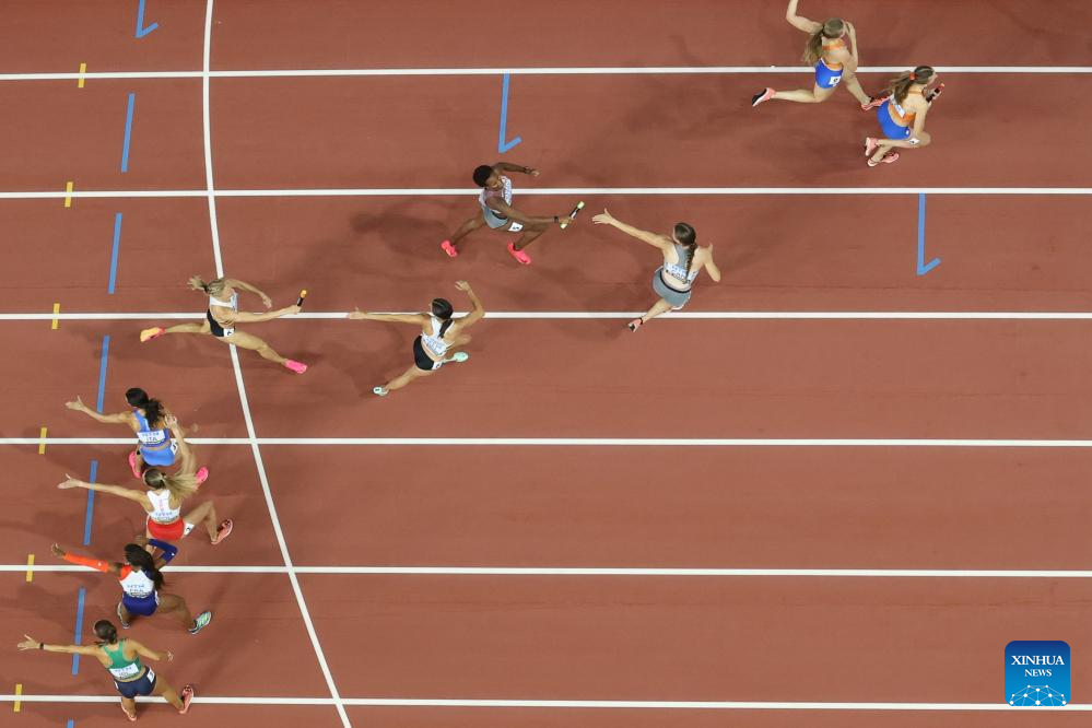 Athletes compete during the Women's 4x400m Relay Final of the World Athletics Championships Budapest 2023 in Budapest, Hungary, Aug. 27, 2023. (Xinhua/Meng Dingbo)