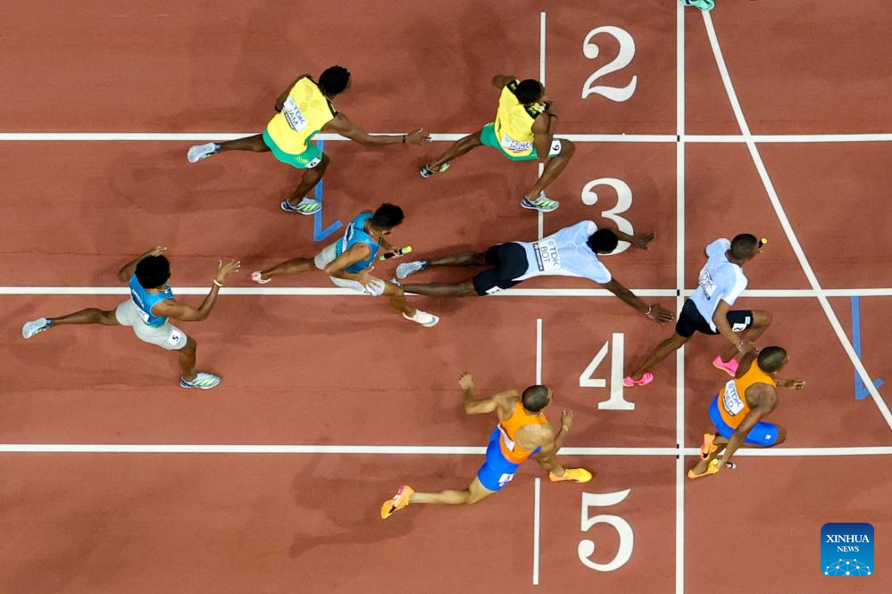 Zibane Ngozi (C) of Botswana falls over during the Men's 4x400m Relay Final of the World Athletics Championships Budapest 2023 in Budapest, Hungary, Aug. 27, 2023. (Xinhua/Meng Dingbo)