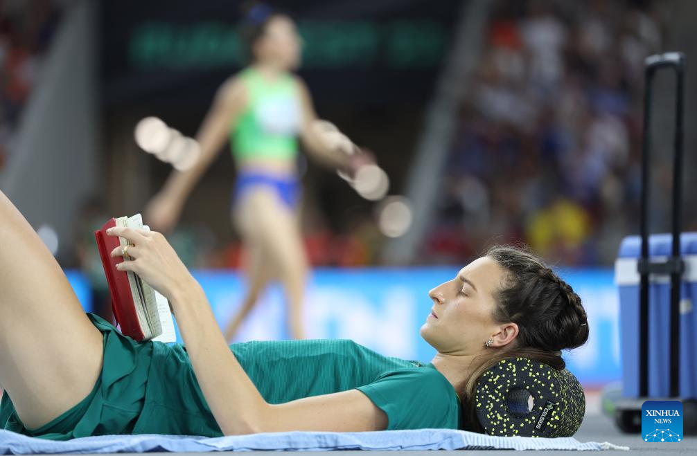 Nicola Olyslagers of Australia reads notes during the Women's High Jump Final of the World Athletics Championships Budapest 2023 in Budapest, Hungary, Aug. 27, 2023. (Xinhua/Li Ming)