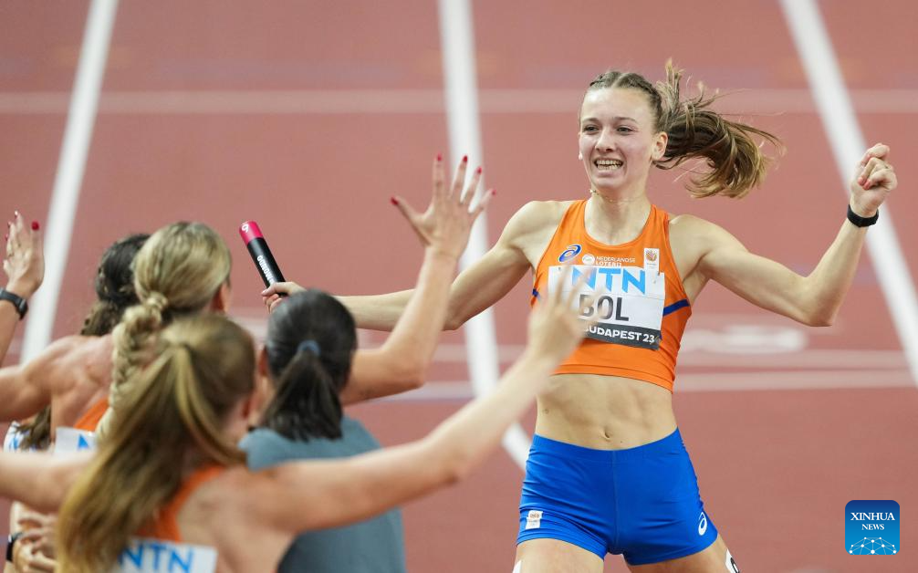 Athletes of the Netherlands' 4x400m relay teams celebrate after the Women's 4x400m Relay Final of the World Athletics Championships Budapest 2023 in Budapest, Hungary, Aug. 27, 2023. (Xinhua/Wang Lili)
