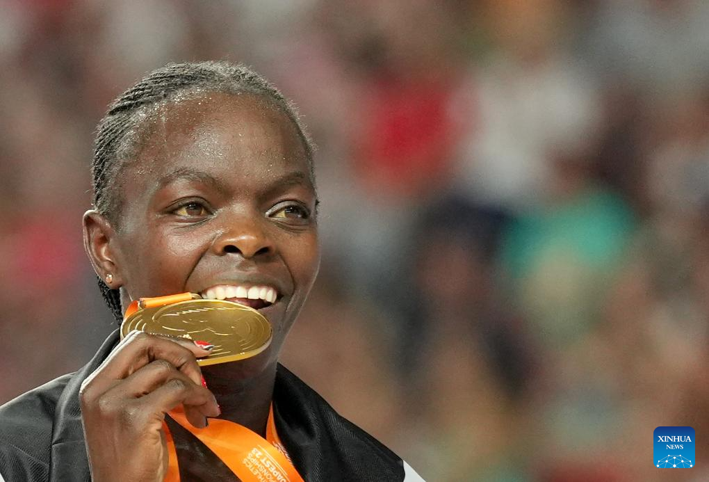 Mary Moraa of Kenya bites her medal after winning the Women's 800m Final of the World Athletics Championships Budapest 2023 in Budapest, Hungary, Aug. 27, 2023. (Xinhua/Li Ying)