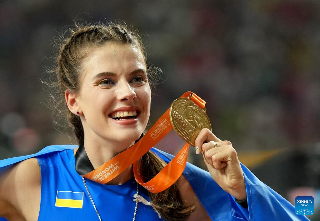 Yaroslava Mahuchikh of Ukraine celebrates after winning the Women's High Jump Final of the World Athletics Championships Budapest 2023 in Budapest, Hungary, Aug. 27, 2023. (Xinhua/Wang Lili)