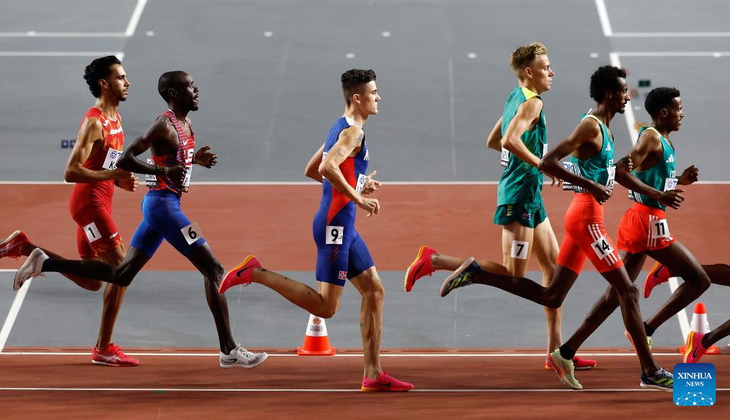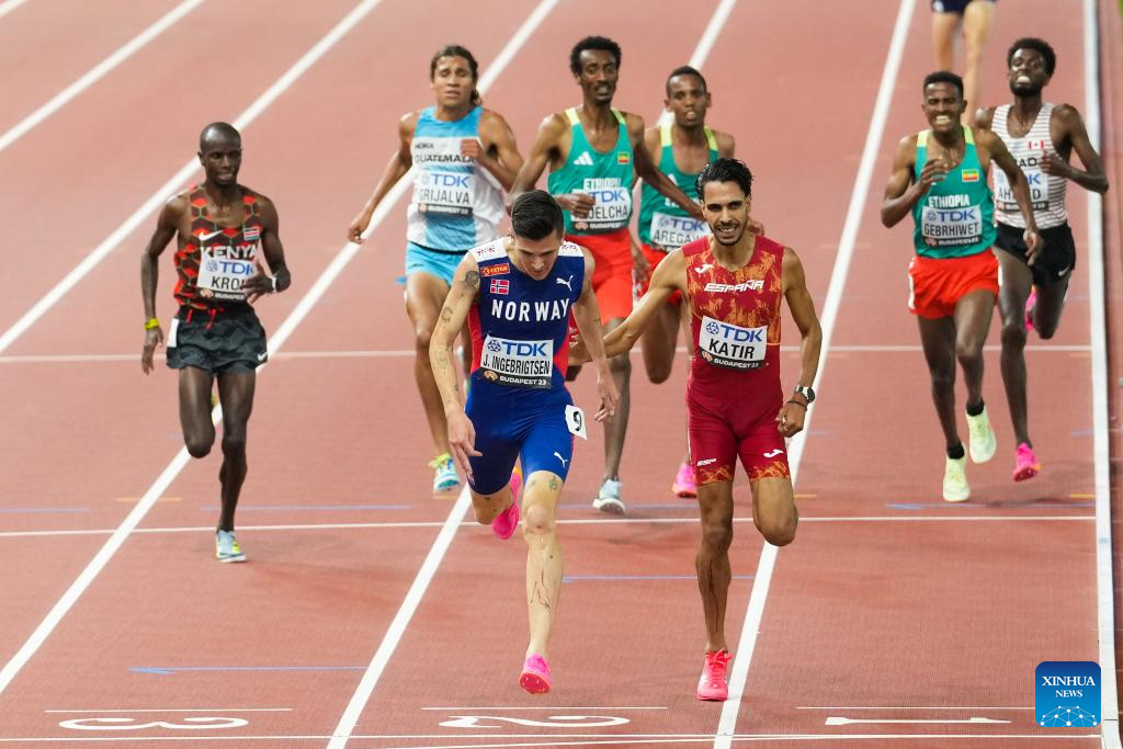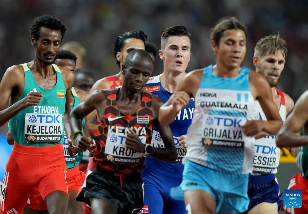 Jakob Ingebrigtsen (3rd R) of Norway competes during the Men's 5000m Final of the World Athletics Championships Budapest 2023 in Budapest, Hungary, Aug. 27, 2023. (Xinhua/Li Ying)