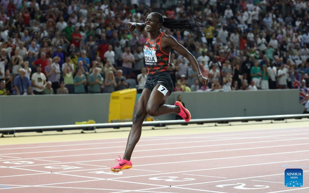 Mary Moraa of Kenya celebrates as she crosses the finish line after the Women's 800m Final of the World Athletics Championships Budapest 2023 in Budapest, Hungary, Aug. 27, 2023. (Xinhua/Li Ming)