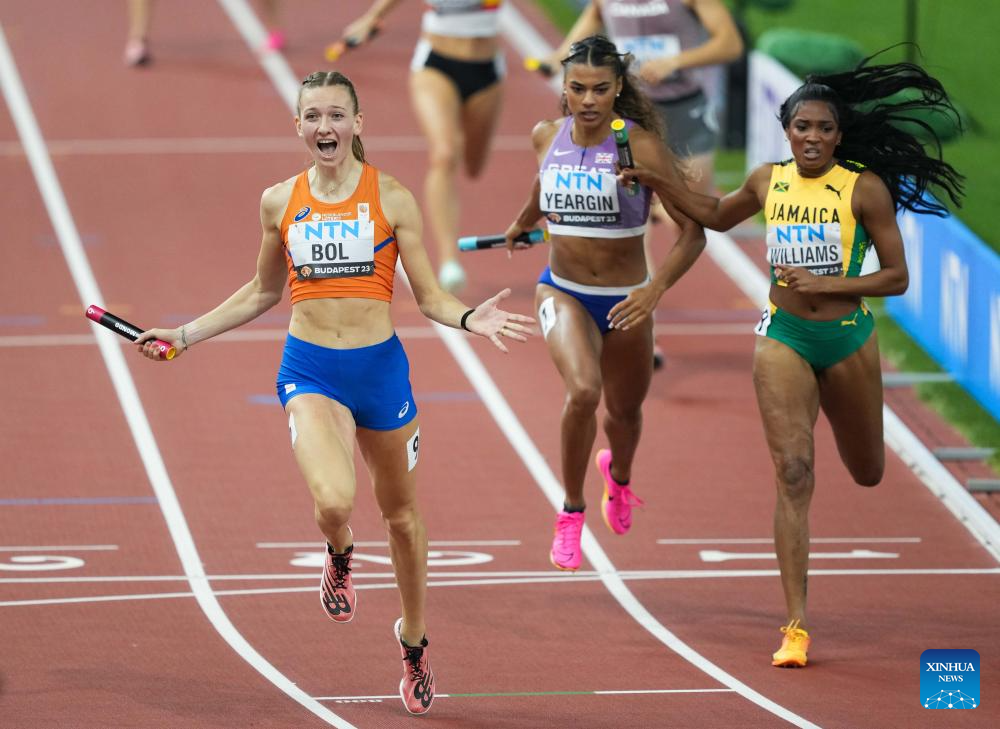 Femke Bol (L) of the Netherlands celebrates after crossing the finish line during the Women's 4x400m Relay Final of the World Athletics Championships Budapest 2023 in Budapest, Hungary, Aug. 27, 2023. (Xinhua/Zheng Huansong)