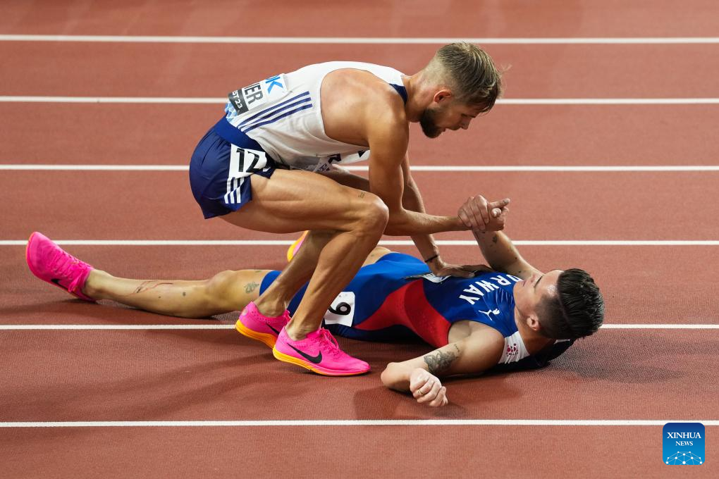 Jakob Ingebrigtsen (bottom) of Norway is congratulated by Jimmy Gressier of France after the Men's 5000m Final of the World Athletics Championships Budapest 2023 in Budapest, Hungary, Aug. 27, 2023. (Xinhua/Zheng Huansong)