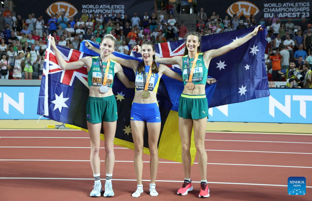 Gold medalist Yaroslava Mahuchikh (C) of Ukraine, silver medalist Eleanor Patterson (L) of Australia and Nicola Olyslagers of Australia pose for pictures after the Women's High Jump Final of the World Athletics Championships Budapest 2023 in Budapest, Hungary, Aug. 27, 2023. (Xinhua/Li Ming)